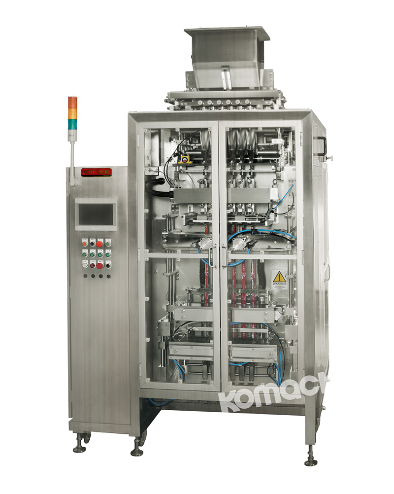 本機是對充填顆粒以及粉末專用而開發的多列式條狀包裝機。將要使用的薄膜卷安裝在本機上,在指定列上分割薄膜后,分別制成筒狀長袋,同時間歇自動計量充填包裝,操作簡單可靠,袋長、袋寬均可調。光電控制精確。因采用滑板或螺桿式計量裝置,每列充填量均可調。本機適用于批量及大量生產產品的場合。